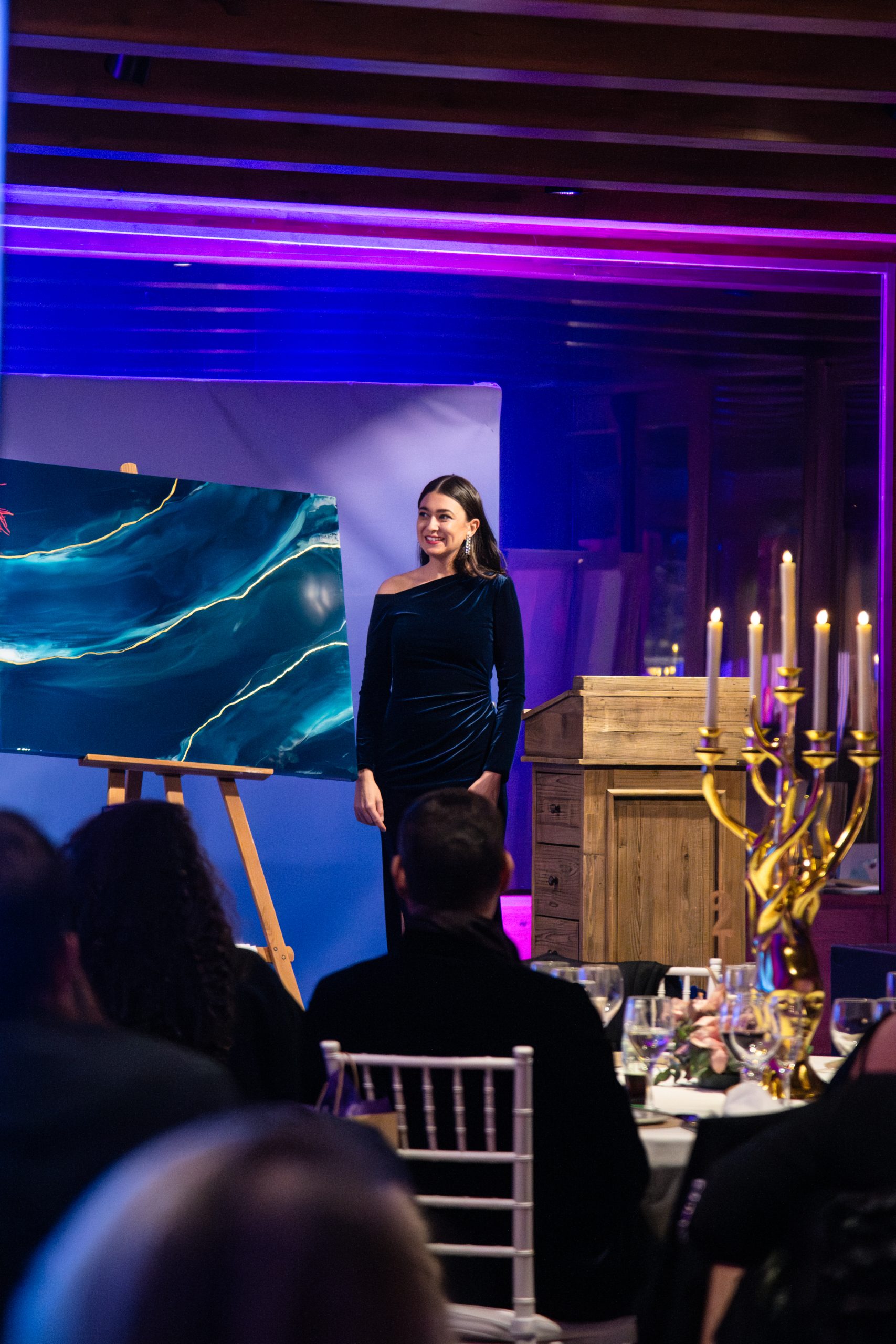 La exposición, abierta al público hasta finales de marzo, reunió un total de 10 obras de gran formato. Bajo el título “AUREA”, la muestra evocaba la energía de la naturaleza, su mayor fuente de inspiración, algo que se percibe claramente en sus obras, incluso siendo totalmente abstractas. Los espectadores pudieron experimentar la conexión que la artista mantiene con el mar y la montaña, calificando su obra en algunos casos como una creación con alma.