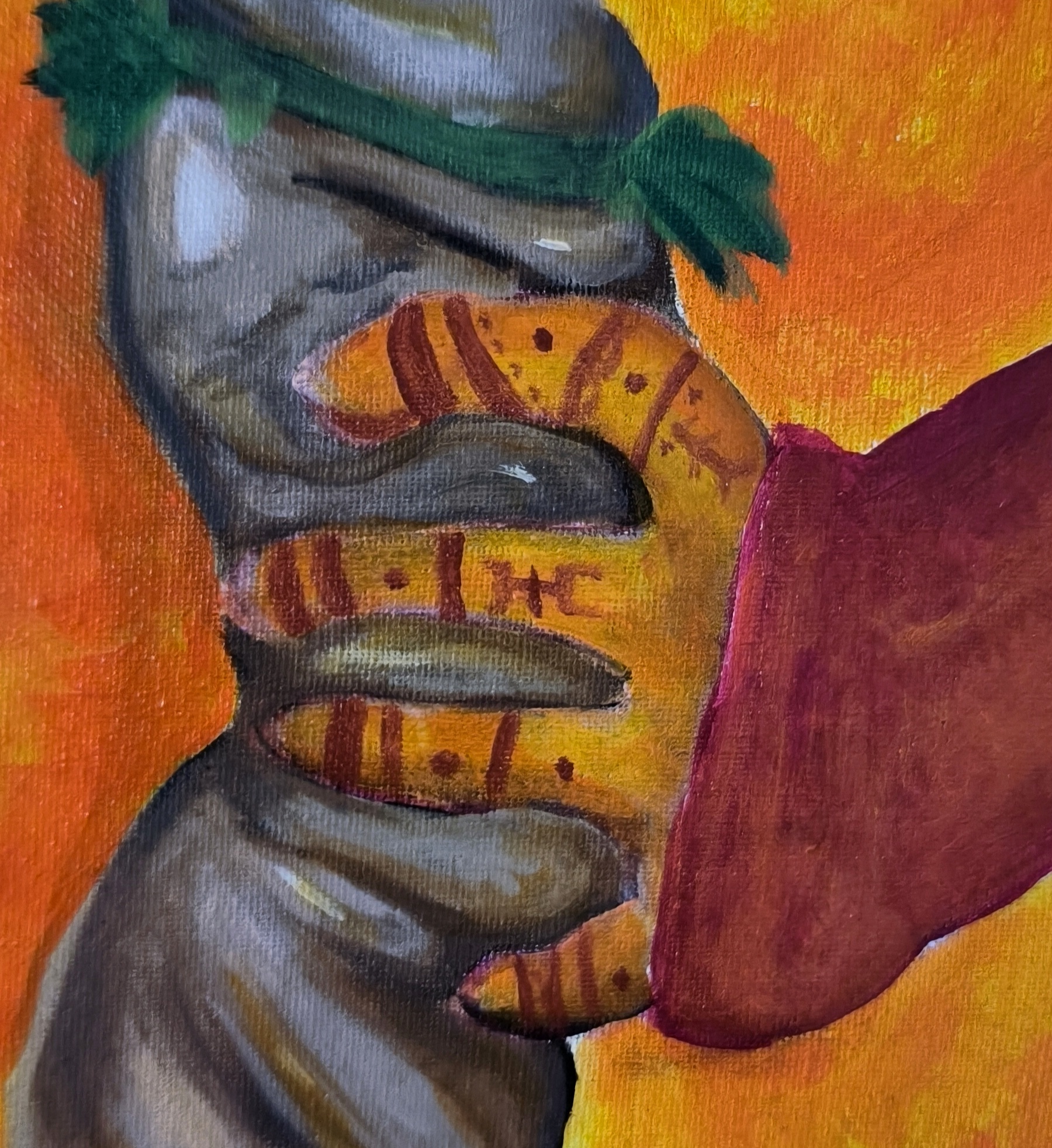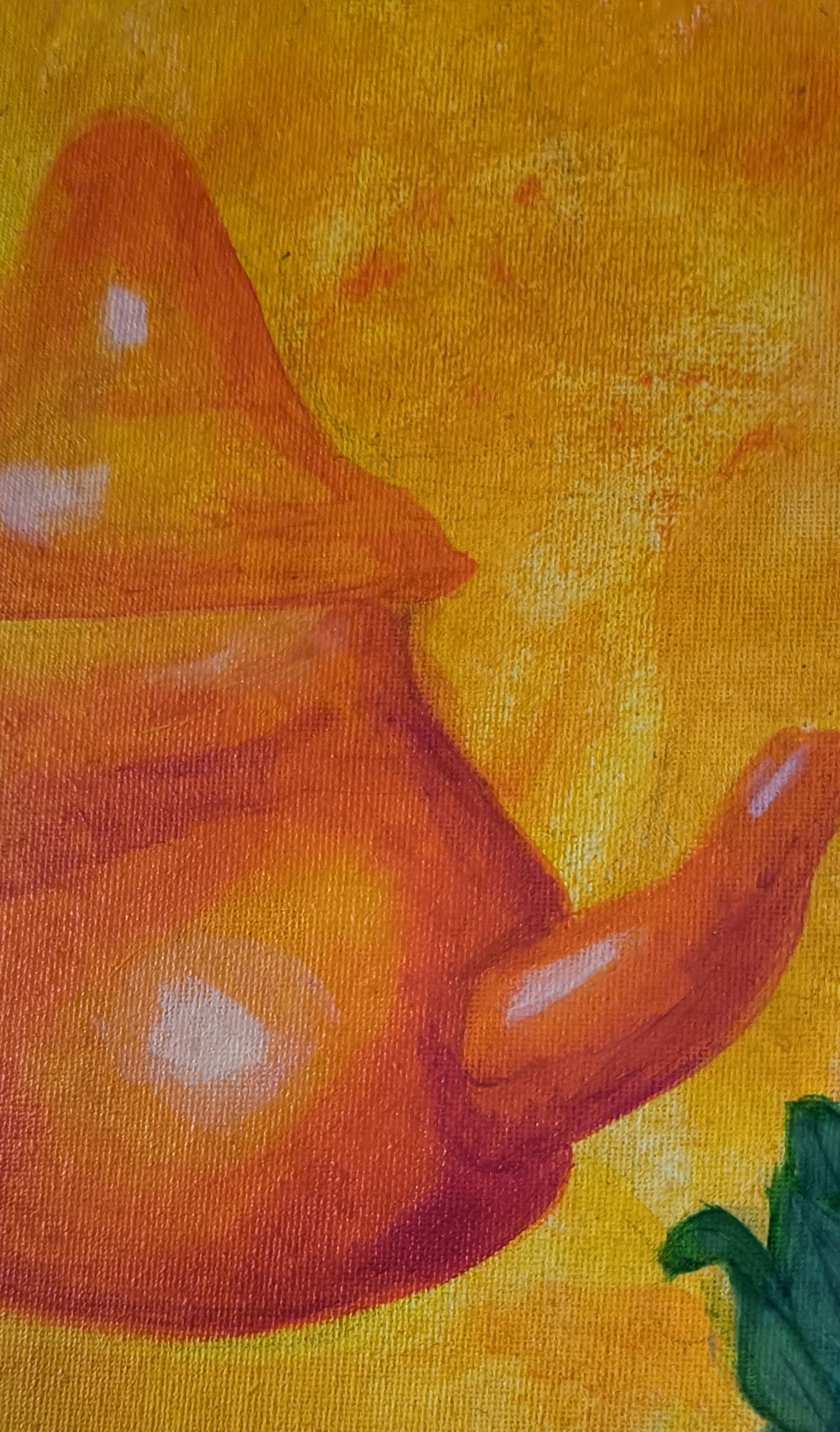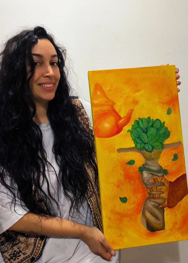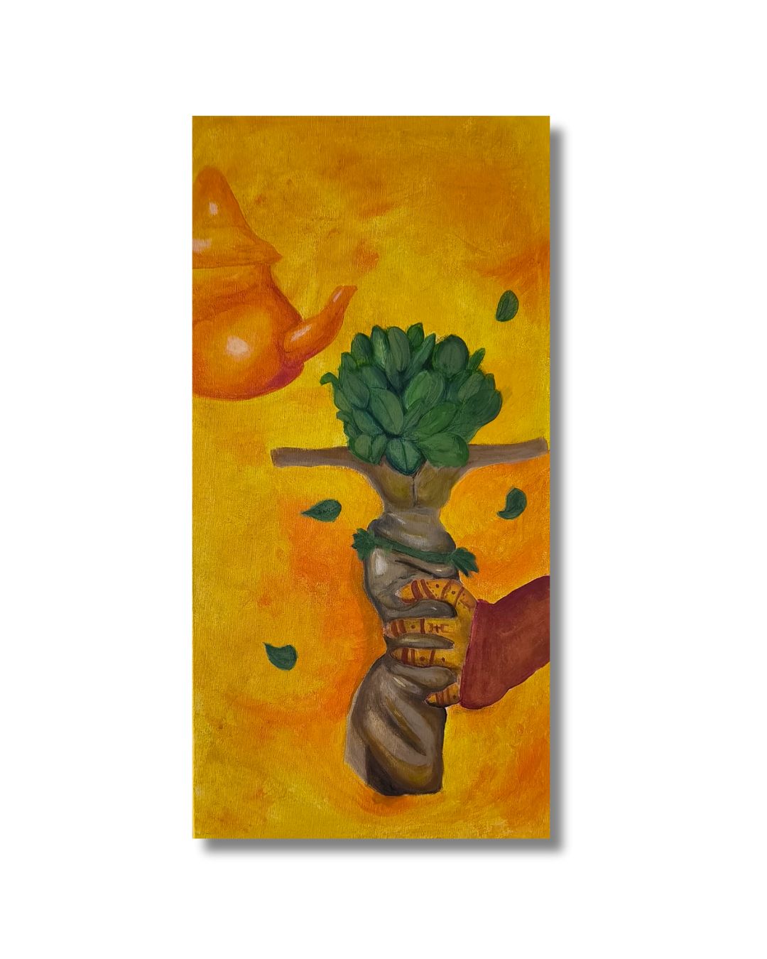Esta obra nace en Marruecos, un lugar muy importante para mí. Paseando por las calles de un pequeño pueblo, vi a dos mujeres con las compras, y una llevaba consigo un ramo de menta fresca. Además de ver a estas dos mujeres juntas, también vi a una mujer en el ramo de menta, porque así es como funciona mi cerebro. Este cuadro representa elementos que evocan el té a la menta (atay b-naana), y no solo tuve la suerte de probar el té, sino toda la experiencia, que en Marruecos simboliza la compartición, y más allá del té, compartí la experiencia de estar en contacto con mujeres locales, de beber té y de bailar juntas.
