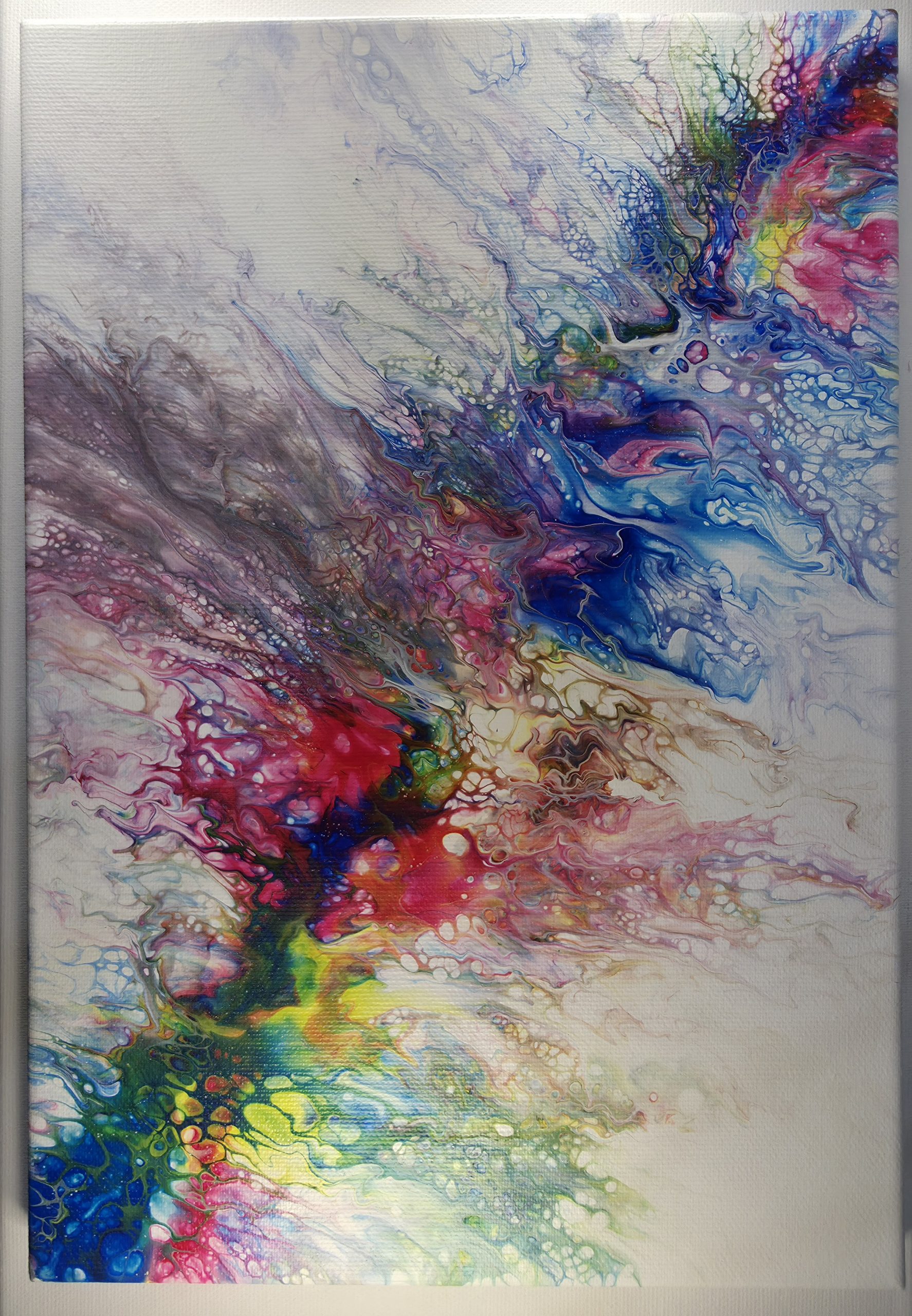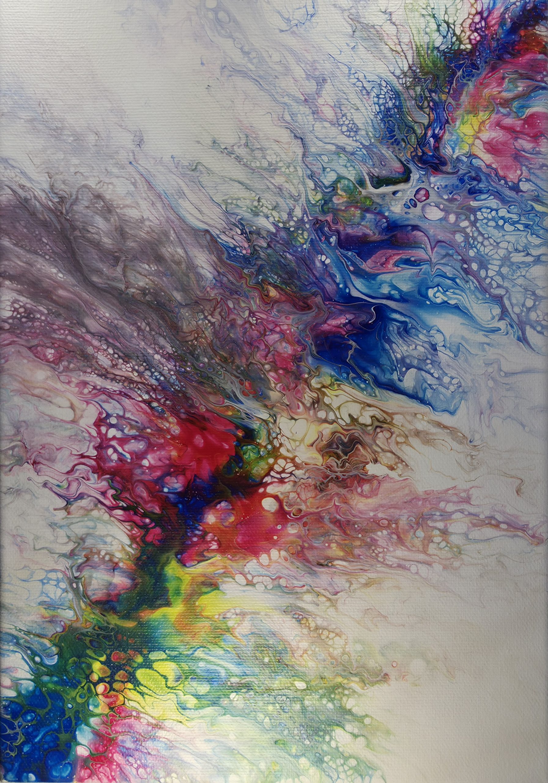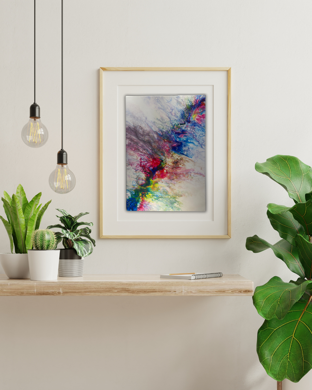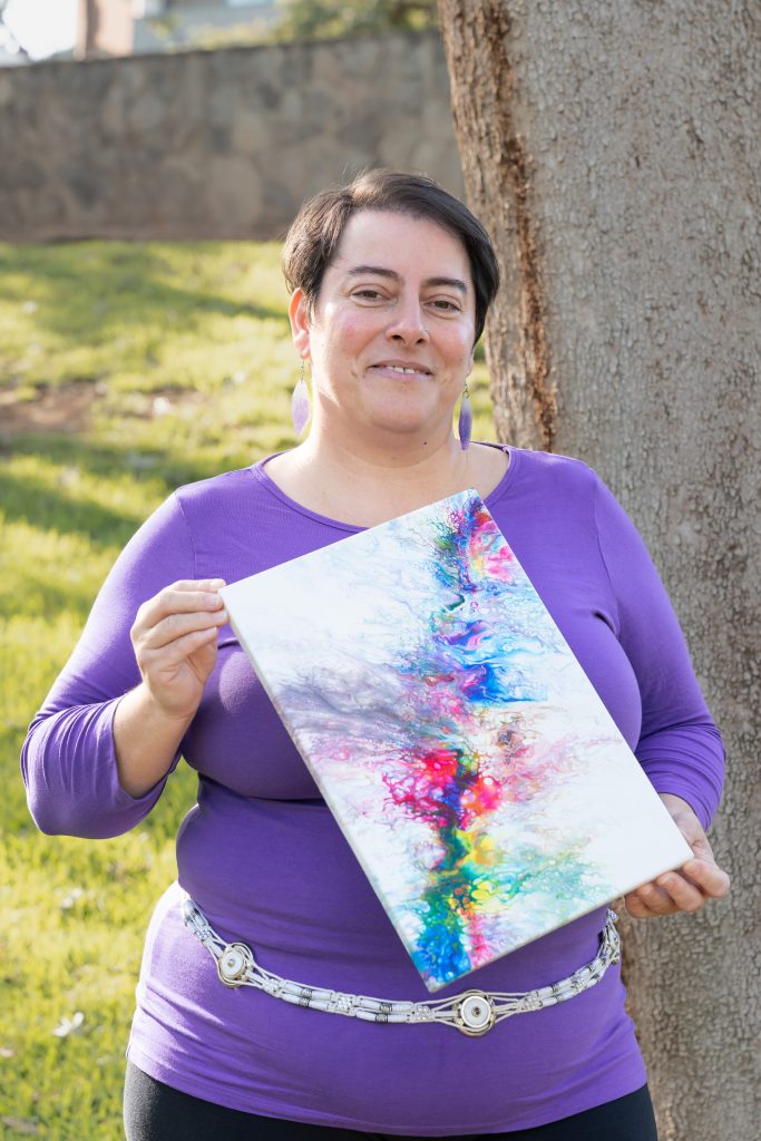 “Esta obra de arte fluido es un reflejo de la conexión entre la naturaleza y las emociones de una mujer, donde los colores vibrantes fluyen como sentimientos en libertad.