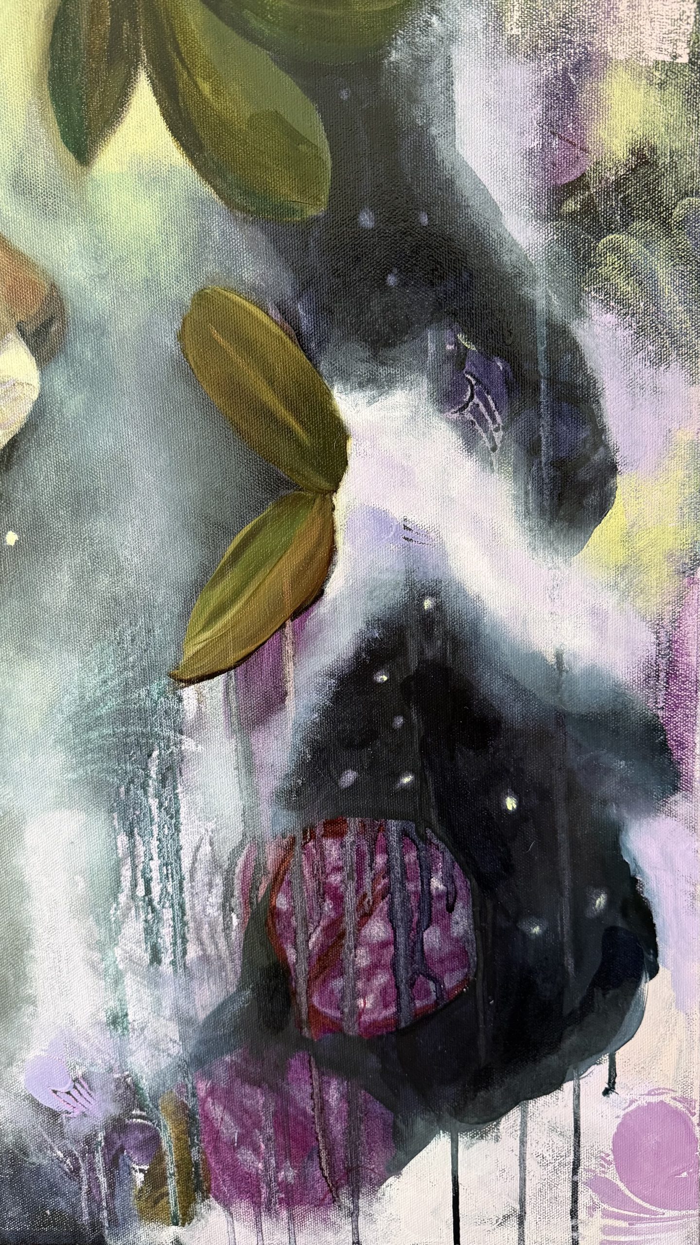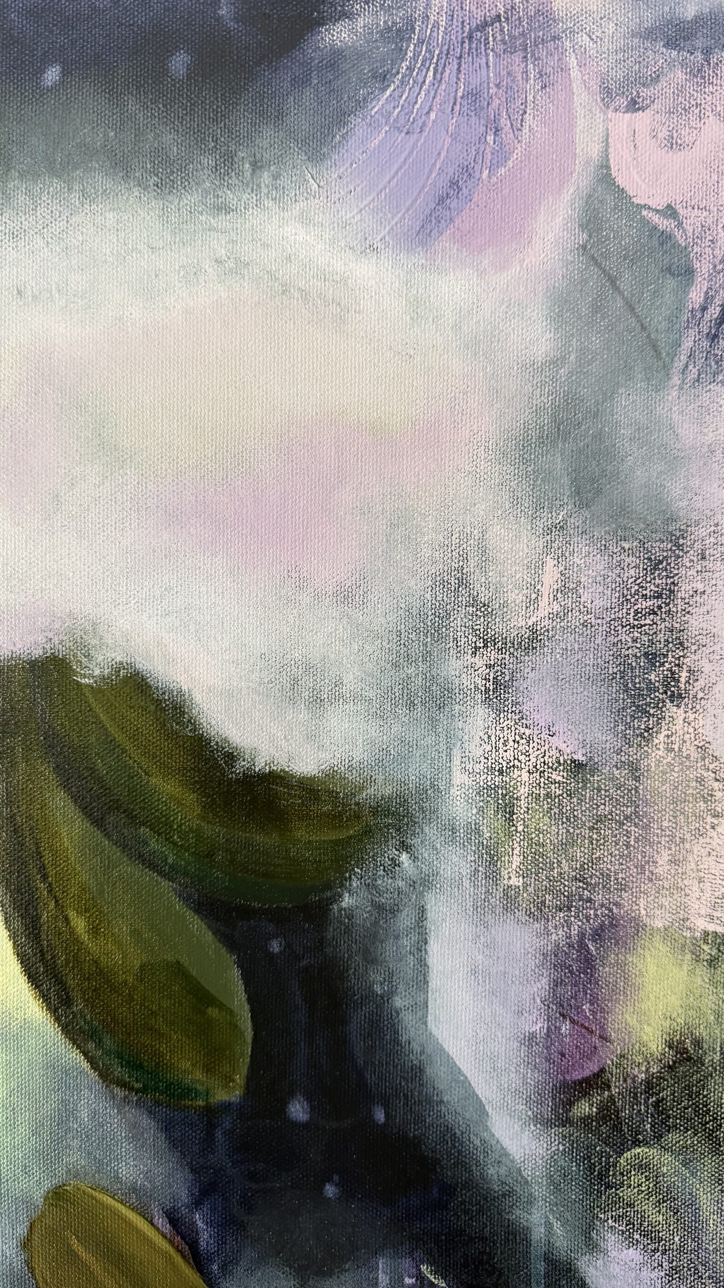 Su proceso comienza de manera libre con técnicas mixtas, sin pretensiones ni planes, simplemente dejándose llevar por lo que va surgiendo. Comenzando con trazos y marcas sobre el lienzo con “”mark making””, la artista deja una marca en el mundo, una declaración de valentía. Seguido a estos trazos, utiliza las tintas. La fluidez de éstas en el agua refleja como cada una va encontrando su propio camino hacia la libertad de ser una misma sin juicios. A continuación, da paso a la pintura al óleo, la protagonista mayoritaria de sus pinturas. Va construyendo la obra de forma gradual, desde capas finas y delicadas hasta una pintura más rica y espesa, permitiendo siempre que queden capas del inicio visibles, representando así el pasado que nos moldea, pero que no nos define.