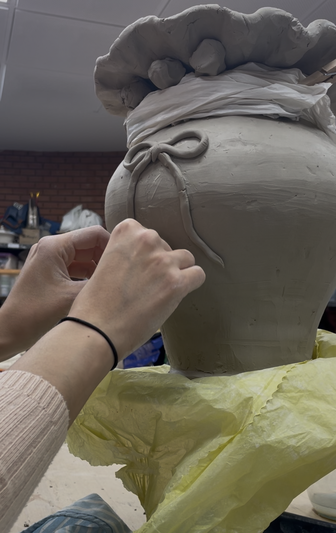 El lacito, elemento clásico de la feminidad, se asienta en la pieza como un recordatorio de que la belleza y la delicadeza no están reñidas con la fuerza. Las raíces doradas en la base evocan el arraigo, la conexión con lo ancestral y con la tierra que nos nutre. La boca ondulada refleja la fluidez de la vida, la adaptación constante de la mujer a su entorno. La resina rosada que desciende desde su interior simboliza la emoción como fuerza creadora, la sensibilidad que fluye como un río moldeando su cauce.